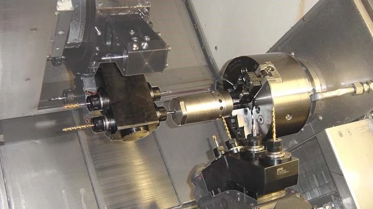 The utilization of the Z-axis is even more effective. On a two-spindle machine, two tool holders for the main spindle and two tool holders for the sub-spindle are used. A complex workpiece can be machined with tool capacity left over. When utilizing all the tool spaces to the maximum, the machine can be equipped with up to 72 tools, drastically increasing machine production capability, reducing downtime and overall production costs.