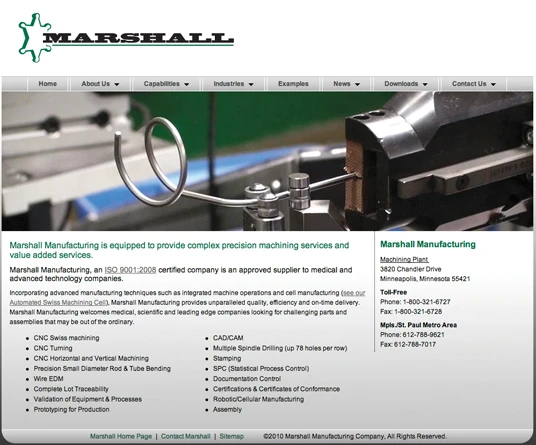 The launch of Marshall Manufacturing’s newly re-designed website marshallmfg.com, unveils its enhanced identity as a strategic provider of precision machining services for Medical equipment manufacturers. The dynamic new website communicates Marshall Manufacturing’s unique capabilities as an ISO certified manufacturer of complex precision machining services and value added services. Extremely user friendly to navigate, the site provides the viewer with everything needed to evaluate Marshall Manufacturing’s capabilities. Among these are CNC Swiss machining, CNC milling, custom bending, induction brazing, stamping, packaging and many others.