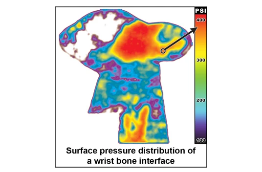 The film is a convenient medium for measuring interfacial stresses at joint surfaces, both physiological and prosthetic. When placed in the interface, Pressurex changes color in direct proportion to the actual pressure applied. The result is an instantaneous and permanent “topographical” image of pressure magnitude and distribution across the contact area. Precise pressure magnitude is easily determined by comparing color variation results to a color correlation chart (conceptually similar to interpreting Litmus paper). Pressurex conforms to curvaceous surfaces and can be hand or laser cut to specific shapes and dimensions.