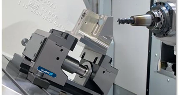 The Kontec KSX fits into the SCHUNK modular system for efficient workpiece clamping. The clamping pins of the VERO-S quick-change pallet system can be directly integrated into the base body of the 5-axis clamping vise. Combined with the quick-change pallet system, it can be quickly exchanged with a maximum repeat accuracy on the machine table.