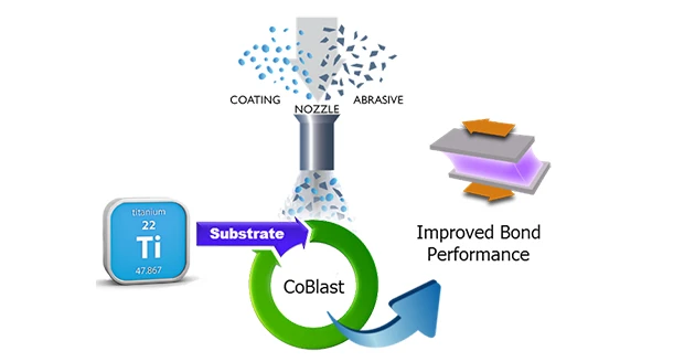CoBlast is a one-step, ambient temperature, ambient pressure, solvent free process that involves the simultaneous blasting of abrasive and coating powders (dopant) onto a metal surface from a single nozzle. The abrasive mechanically abrades the substrate, exposing active chemical bond to which the coating particles bond before an oxide layer can reform. It enables the removal of surface contaminants and weak boundary layer such as weak oxide layers in a more environmentally friendly manner than current pre-treatment methods.