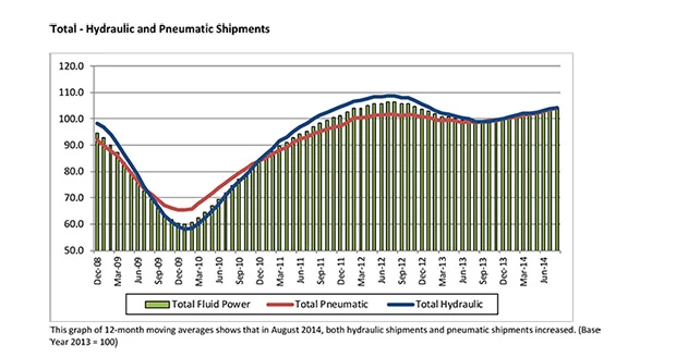 Cleveland, Ohio – The latest data published by the National Fluid Power Association shows industry shipments of fluid power products for August 2014 increased 4.0% compared to August 2013, and decreased 4.7% when compared to last month. Industrial hydraulic and pneumatic shipments increased, while mobile hydraulic shipments decreased in August 2014 when compared to August 2013. Pneumatic shipments increased, while mobile hydraulic and industrial hydraulic shipments decreased when compared to last month. These charts are drawn from data collected from more than 80 manufacturers of fluid power products by NFPA’s Confidential Shipment Statistics (CSS) program.