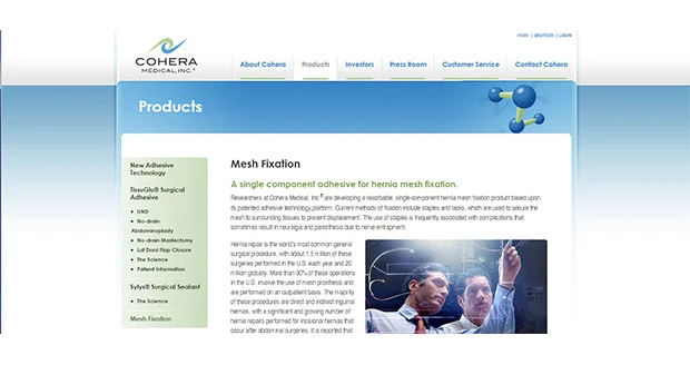 "We are excited to add this patent to our growing intellectual property portfolio, which enhances our leadership position in internal surgical adhesives," said Patrick Daly, president and chief executive officer of Cohera Medical. "This patent protects novel technology that could change the landscape in the surgical placement of meshes and matrices to the benefit of patients worldwide."