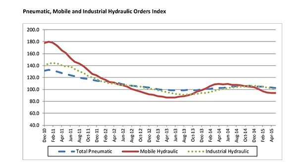 Each point on this graph represents the most recent 12 months of orders compared to the previous 12 months of orders. Each point can be read as a percentage. For example, 99.5 (the May 2015 level of the industrial hydraulic series) indicates that industrial hydraulic orders received from June 2014 to May 2015 were 99.5% of the orders received from June 2013 to May 2014. (Base Year 2013 = 100)