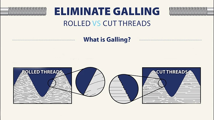 Galling is caused by friction between sliding metal surfaces and can lead to contamination, seizing, and loosening of threaded parts. Proper lubrication is one preventive strategy, but specifying rolled vs. cut threads is another effective way to eliminate galling. Rolled threads are smooth and free of tears and chatter, which are common starting points for galling.