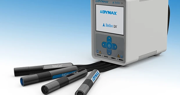 Torrington, Connecticut – Dymax Corp. officials have released the BlueWave QX4 high-intensity spot-curing system, featuring all the benefits of LED-curing technology in a small and versatile unit. The system is comprised of a controller and up to four LED heads, which are available in 365nm, 385nm, and 405nm and can be outfitted with 3mm, 5mm, or 8mm diameter focusing lenses. The LED heads and focusing lenses can be used in any combination and can be controlled through the system’s variable mode, a feature that allows each head to be individually programed for intensity and cycle times. Individual exposure times and intensity settings can be set in 1% increments for each LED head, giving users maximum curing flexibility.