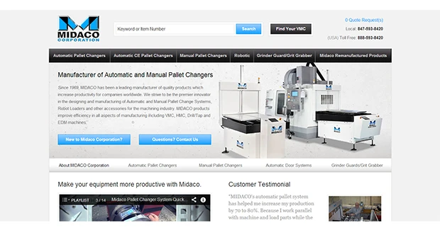 Established in 1969 and based out of Elk Grove Village, Ill., Midaco’s automatic and manual pallet changers, automatic door openers and accessories are designed to save manufacturing time and increase productivity on machining centers. The company continually seeks to develop and create new products to stay ahead of the technology curve, providing the latest innovations to customers worldwide.