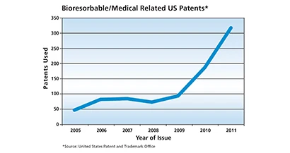 “Another example is the explosion of medical implant applications using bioresorbable polymers,” continued Acquarulo. “According to the United States Patent and Trademark Office database, the number of patents issued referencing bioresorbable and medical grew from 48 in 2005 to 311 in 2011, a rise of 548%. In 2012 there have been 229 related patents issued year to date.”