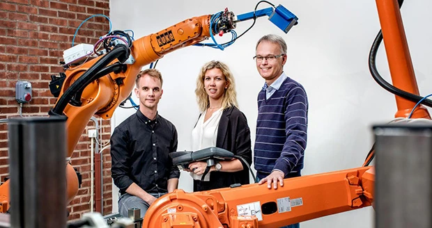 (Above) From left are: Dr. Kristofer Bengtsson, master student Emma Vidarsson and Professor Bengt Lennartson in the Robotics and Automation Laboratory at Chalmers University of Technology. By minimizing the acceleration of industrial robots, and optimizing the sequence of multiple robots, energy consumption can be reduced by up to 40%.