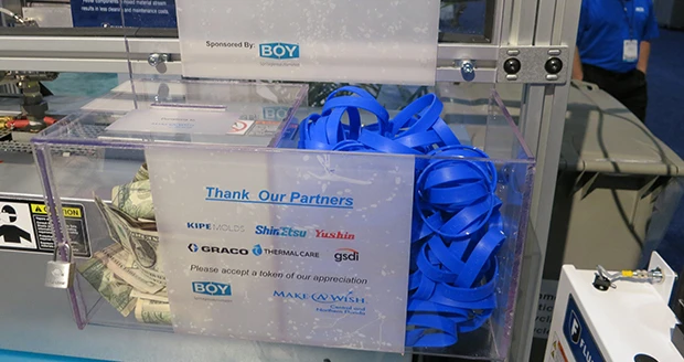 A leader in high-precision small and micro-injection molding machines with clamping forces up to 110 tons, Boy Machines demonstrated their BOY 25 E that was individually tailored to produce customized LSR wrist bands for the Make-A-Wish foundation−the largest organization in the world fulfilling the wishes of children with life-threatening medical conditions. Recently, these bracelets were offered to 60,000+ registered attendees at a conference for a small donation to the foundation’s North Central Florida chapter.