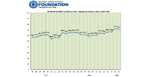 Washington, D.C. –- The Equipment Leasing & Finance Foundation has released the April 2015 Monthly Confidence Index for the Equipment Finance Industry (MCI-EFI). Designed to collect leadership data, the index reports a qualitative assessment of both the prevailing business conditions and expectations for the future as reported by key executives from the $903 billion equipment finance sector. Overall, confidence in the equipment finance market is 70.7, easing from the 4-year high of 72.1 in March.