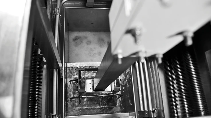 A basket containing dirty parts is lowered through the vapors into the boil sump where the primary cleaning occurs. Then the basket is lifted into the rinse sump, which always contains clean, distilled solvent that has been condensed from the vapors, providing a final cleaning to the components. The parts then are slowly removed from the machine and on to the next process. Normal cleaning cycles are 8 to 15 minutes per batch, faster than aqueous cleaning systems. The parts come out clean, dry, and immediately ready for packaging or further processing.