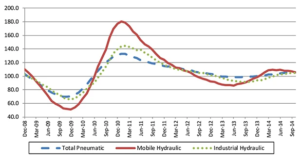 Milwaukee, Wisconsin – The latest data published by the National Fluid Power Association (NFPA) shows industry shipments of fluid power products for November 2014 decreased 1.0% compared to November 2013, and decreased 15.7% when compared to last month. Mobile hydraulic shipments decreased, while industrial hydraulic and pneumatic shipments increased in November 2014 when compared to November 2013. Mobile hydraulic, industrial hydraulic, and pneumatic shipments decreased when compared to last month. These charts are drawn from data collected from more than 80 manufacturers of fluid power products by NFPA’s Confidential Shipment Statistics (CSS) program. Much more information is available to NFPA members, which allows them to better understand trends and anticipate change in their market and the customer markets they serve. Contact NFPA at 414.778.3344 for more info.