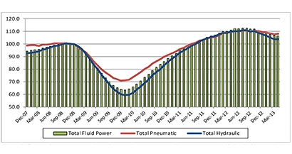 The latest data published by the National Fluid Power Association shows industry shipments of fluid power products for April 2013 decreased 1.3% compared to April 2012, and increased 1.6% compared to last month. Mobile hydraulic & industrial hydraulic shipments decreased and pneumatic shipments increased in April 2013 when compared to April 2012. All three market segments increased when compared to last month. These charts are drawn from data collected from more than 80 manufacturers of fluid power products by NFPA’s Confidential Shipment Statistics (CSS) program. Much more information is available to NFPA members, which allows them to better understand trends and anticipate change in their market and the customer markets they serve. Contact NFPA at 414.778.3344 for more info.