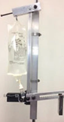 (Left) The IV DRIP uses a system of weights to limit the maximum amount of fluid given to the patient.