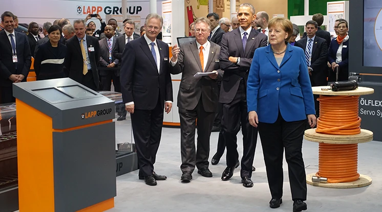Stuttgart/Hanover, Germany – The Stuttgart-based Lapp Group received a visit from some very important guests at its booth at the 2016 Hannover Messe trade fair: U.S. President Barack Obama and German Chancellor Angela Merkel learned all about the latest innovations from the Swabian family-run business.