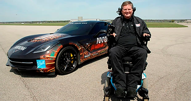 Schmidt started off the week completing two warm-up and four qualifying laps on Pole Day in a modified 2014 Chevrolet C7 Corvette Stingray controlled by his head using OptiTrack motion capture technology. Schmidt’s trip around the track maxed out at speeds of 80mph and marked his first laps on a professional raceway since a 2000 crash at Walt Disney World Speedway in Orlando left him paralyzed.
