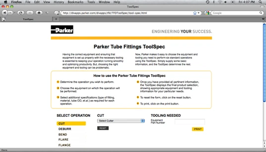 ToolSpec, the new web-based app from Parker Hannifin Corporation, the global leader in motion and control technologies, makes it fast and easy to choose the equipment necessary to perform a variety of standard tube assembly operations. Determining the appropriate equipment for an operation is much easier with ToolSpec because it applies basic information supplied by users to find a suitable match.