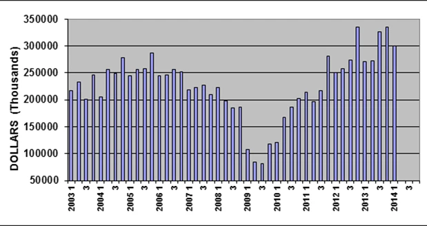 The historical data shows that the shipments total typically declines in the first quarter of the year when compared with the fourth quarter of the previous year. Due to tax considerations and other budget-related reasons, the fourth quarter is usually the strongest quarter of the year for machinery shipments, and the first quarter is often the weakest. Nevertheless, 2014 is off to a good start. The total for Q1 of this year represented a robust gain of almost 11% when compared with the same quarter of 2013. For the sake of comparison, the total value for primary plastics equipment shipments in 2013 was up 8% when compared with the annual total from 2012.