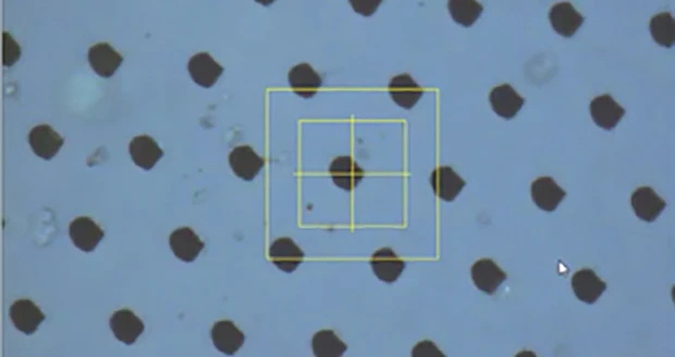 An automated optical CNC video measuring system was used to evaluate nine holes, laser-drilled through a 0.005mm-thick sheet of Kapton film; each hole had a nominal 4.5µm diameter. Each hole was measured 10 times by the automated optical system based on image contrast and edge detection. For comparison, all nine of the laser-drilled holes were also measured using a SEM to obtain nominal reference diameter values. A similar evaluation was performed on the glass sample with nominal 2.0µm laser-drilled holes, with 10 repeat measurement runs and SEM verification measurements.