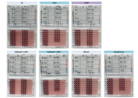 The tests were carried out on test specimens made of stainless steel 1.4301 and 1.4305 with different surface finishes, as well as polyetheretherketone (PEEK), polyether (PE), polyoxymethylene (POM), nitinol, cobalt-chromium, and glass vials.