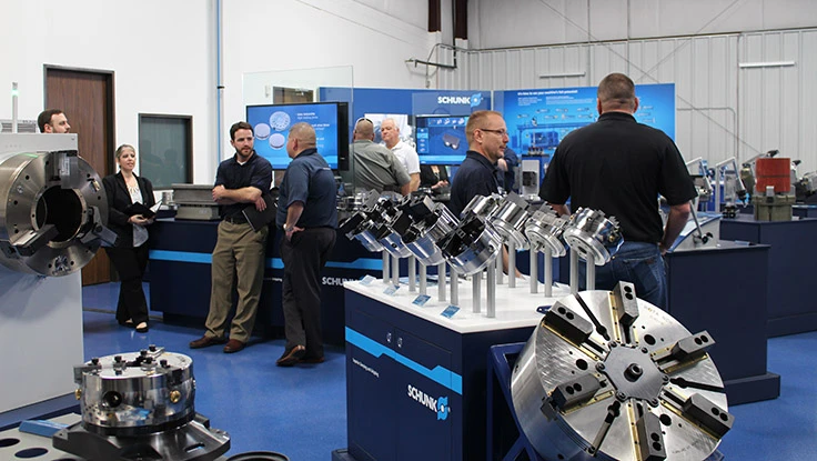 The SCHUNK Houston Tec-Center has a milling machine, lathe, air chuck display, and robotic machine-loading display, giving manufacturers the ability to see a variety of processes using real parts and machines.