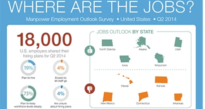 Milwaukee – The latest Manpower Employment Outlook Survey, released by ManpowerGroup, reaffirms continued hiring confidence in the second quarter of 2014, as U.S. employers report a seasonally adjusted Net Employment Outlook of +13%. This is the third consecutive quarter with a Net Employment Outlook of +13%, which is the strongest Outlook since Quarter 2 2008 when the Outlook was +14%. The Quarter 2 Outlook is slightly stronger than one year ago when the Outlook was +11%.