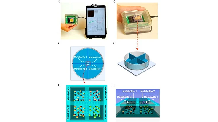 The chip is smaller than a fingertip and is divided into multiple reaction zones to detect and quantify four metabolites simultaneously from body fluid such as serum or urine. The device can be operated via any Android-based tablet or smartphone which provides data acquisition, computation, visualization, and power.