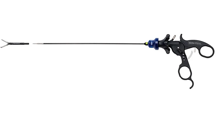 Teleflex’s Percuvance Percutaneous Surgical System is a family of instruments used to perform laparoscopic procedures. It includes components that introduce a variety of instrument configurations into the abdominal cavity and requires a smaller incision site than traditional laparoscopic surgery. It offers reusable handles and seven disposable 5mm interchangeable tool tips, which include graspers, scissors, dissector, electrocautery tools, and a Weck Hem-o-lok Polymer Ligation Clip Applier. Unlike some other laparoscopic devices, the Percuvance System affords a percutaneous insertion into the patient without the use of an insertion trocar. The Percuvance Percutaneous Surgical System with 5mm attachments is indicated for the means to penetrate soft tissue to access certain areas of the abdomen. The systems are used to grasp, manipulate, cut, cauterize, and deliver Hem-o-lok System ligating clips to soft tissue during laparoscopic surgery.