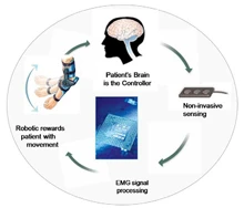 Key system components include: surface electromyography (EMG) sensing, system software, and wearable, portable robotic devices. Since movement is initiated and continuously controlled by an individual’s residual muscle activity, the person’s brain functions as the system controller. With this capability, patients have an opportunity to stop, in real time, during execution of a targeted training task, to evaluate performance and re-adjust positioning, as they train toward muscle re-education. The goal is that through repetition and practice, patients will relearn and achieve more normative movement patterns.