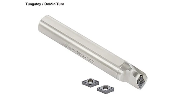 Cleveland, Ohio - Officials from Tungaloy Corp. are pleased to announce the expansion of the DoMiniTurn External Line with round shanks. The round shank can be used in a sleeve holder for main and sub-spindles on automatic lathes increasing efficiency in external turning of miniature parts. Tungaloy’s double-sided DXGU inserts are applicable for this newly developed round shank.