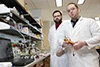 Devon Bane, left, and Tanner Carden with their CarmAl extruder in a lab at UAH’s Shelby Center for Technology. Photo credit: Michael Mercier / UAH