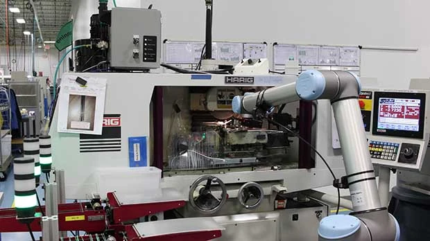 Before Tegra built the UR10 robotic cell, they started out with two smaller cells each tended by a UR5 robot arm, UR10’s “little brother,” featuring same 4 mils repeatability but with a reach of 33.5". The UR5 picks up the blank from the feeder and then moves it between the lathe, the grinder and the conveyor in a cycle that now takes only 10 seconds compared with the 22 seconds it took with manual labor.