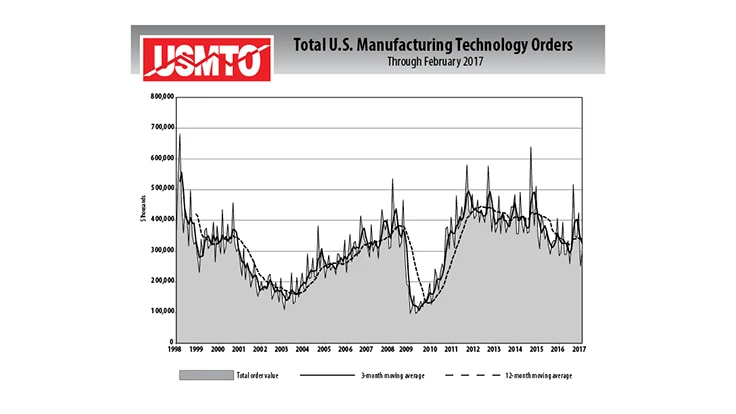Orders for February 2017 totaled $300.51 million, up from January’s $251.36 million. USMTO is a reliable leading economic indicator as manufacturing companies invest in capital metalworking equipment to increase capacity and improve productivity.