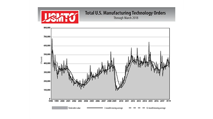 Cleveland, Ohio – U.S. manufacturing technology orders continued to rise in March, increasing 42% over February 2018 and 23% over March 2017, once again demonstrating strong, sustained growth in the sector, according to the U.S. Manufacturing Technology Orders report from AMT – The Association For Manufacturing Technology. Overall, orders totaled $509 million in March, bringing the year-to-date total orders to $1.2 billion.