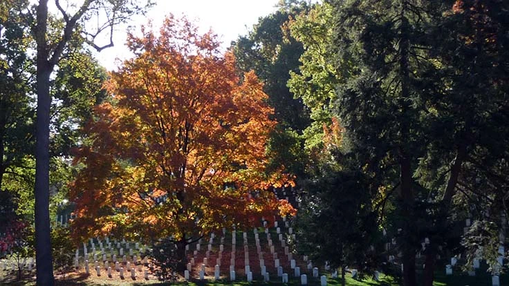 Autumn leaves cover graves at Arlington National Cemetery in Washington D.C.