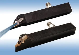 GenSwiss announces the launch of “Coolant Thru” line of coolant through tool holders featuring delivery through the shank providing optimal insert lubrication and cooling, longer cutting tool life and improved Swiss type machining. Holders feature interchangeable coolant orifice plates at the insert top level enable exact control over coolant volume, pressure and velocity as low, medium and high flow action for more efficient chip removal. The holders are available with high pressure to 10,000psi, stock sizes are 1/2" and 5/8" square shank, other sizes available on request. Insert pocket conforms to ISO style turning inserts, 80°, 55°, and 35°. The coolant inlet of the tool holders uses standard NPT fittings, eliminates use of solid coolant delivery lines, allowing for faster setup and more accurate coolant delivery position to the insert. In addition, there is no need for custom proprietary gang plate and no coolant manifold installation is required, or other modifications to the coolant feed systems.