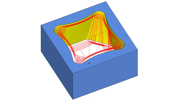 ESPRIT’s 4-axis pocketing takes this concept a step further. Built-in options will automatically identify and isolate the largest area inside a complex cavity that can accommodate a slug drop. This core area is removed with a simple 2-axis contouring operation. Then, 4-axis no-core pocketing wire path is applied to remove only the material that remains.