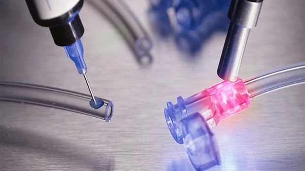 Dymax manufactures medical adhesives for applications such as catheters, tube sets, reservoirs, respiratory masks, syringes, and oxygenators. Encompass technology incorporates the company’s patented See-Cure color-change and Ultra-Red fluorescing technologies into one light-curable product. As a result, customers gain efficiencies from rapid, on-demand curing with easy cure confirmation and post-cure bond-line inspection.