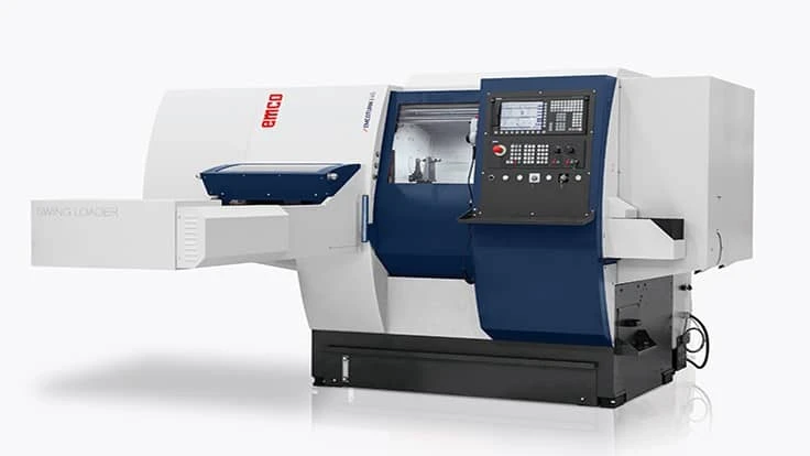 A swing loader is included for automatic loading and feeding out of the machined parts. This extremely compact and integrated loader is controlled via the machine control. The exceptional combination of a swivel movement and a linear movement, driven by servomotors, guarantees simple and fast setup. As a result, preformed raw parts can also be inserted position-oriented into the clamping device. After machining has been completed the finished parts are transported out of the machine via the parts catcher. EMCO has two different versions of bar loaders on offer for bar work – the swing loader as a universal loading system for all types of preformed blanks and the short bar loader SL1200 as the perfect solution for automatic feeding and loading of cut-to-length bars.