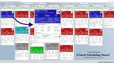 Touch Scheduling Board uses an intuitive drag-and-drop touch screen interface, allowing users to schedule shop order operations, represented as cards, within and between work centers represented as swim-columns.