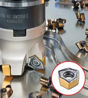 The tools have a 17° lead angle configuration, so the resultant cutting forces are directed axially towards the spindle of a machine tool. In addition, the H600 WXCU 0403 insert is clamped into a dovetail pocket, providing very firm clamping. Available in SUMO TEC grades and various rake angles, the inserts can be used on a wide range of materials and applications. All of the HELIDO-UPFEED cutters have coolant holes.
