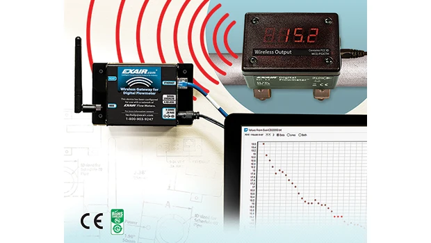EXAIRs Digital Flowmeters with wireless capability use a Zigbee mesh network protocol to measure and monitor your compressed air use, trends, and historical data. Each meter has a range of 100ft (30m) and transmits data to an Ethernet connected gateway. Each meter and gateway are configured for security and have 128-bit encryption for the wireless transmissions. Measuring compressed air is the first step toward identifying high compressed air use areas, compressed air leaks and optimizing air use.