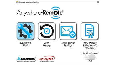 Anywhere-Remote e-mail status update technology allows the user to automatically receive live machine production data anywhere, anytime via email to desktop, smartphones, and mobile devices based on pre-set variables. Machine production alarms, messages, and cycle information can be received in real-time, remotely via the Kitamura Arumatik-Mi control. Machine status updates (running, idle, paused) can be generated for at-a-glance review of how the shop floor is performing, allowing for any errors or bottlenecks to be easily spotted and corrected. Period status events can be analyzed specific intervals by customer specified metrics. A variable change e-mail component of the Anywhere-Remote e-mail status update feature allows the end user to specify variables that they wish to monitor within their shop environment.