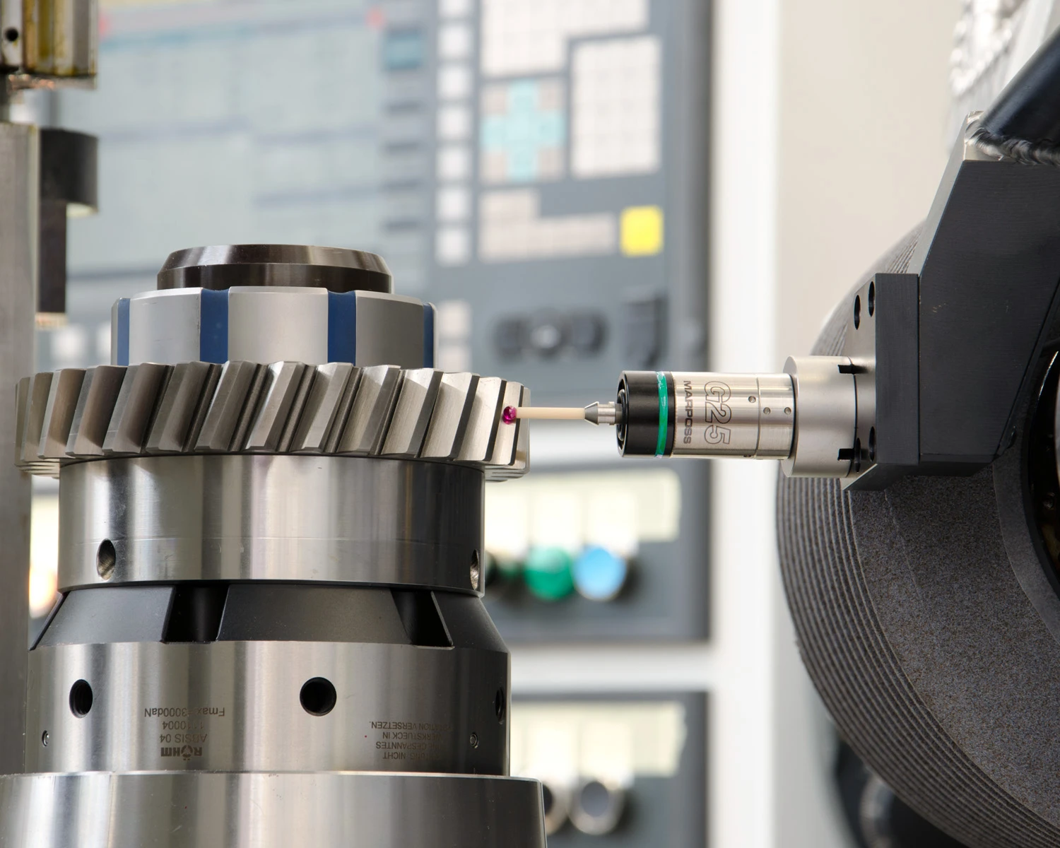 Although the G25 device resembles a touch probe, it is actually a gauge with the ability to do both part surface scanning and perform touch functions for part positioning and measurement. The compact G25 device was developed to gauge parts while still fixtured in the machine in case reworking is required. When used for gear grinding, the G25 gauge identifies the part location and tooth spacing for purposes of aligning the part with the grinding wheel prior to grinding. The same device is then used to scan the profile of the finished part in a continuous cycle. The new G25 gauging probe has excellent measurement stability at high speeds, enabling a significant reduction in inspection time compared to using a touch probe.