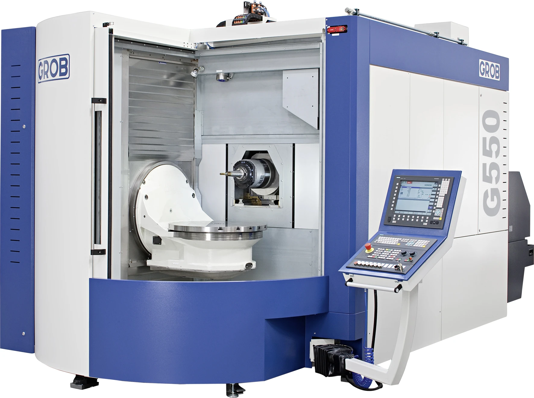 The G550 Universal Machining Center from Grob is designed for single setup machining of complex five-sided parts. This horizontal 5-axis machining center features a Ø30.3” table that rotates 240°in the A-axis and 360° in the B-axis. Many spindle and control options are available, and the machine can be equipped with a 16,000RPM HSK-63A spindle and the Heidenhain iTNC 530 control.