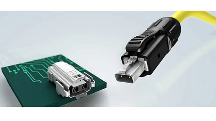 Harting’s T1 Industrial connector – the standard mating face for industrial Single Pair Ethernet – can accomplish communication across common industrial Ethernet protocols (Ethernet/IP, Profinet, EtherCAT) with a single twisted pair of wires instead of four or eight wires. This connector uses power-over-data-line (PoDL) technology to bring communication, voltage, and amperage needed to power the device.