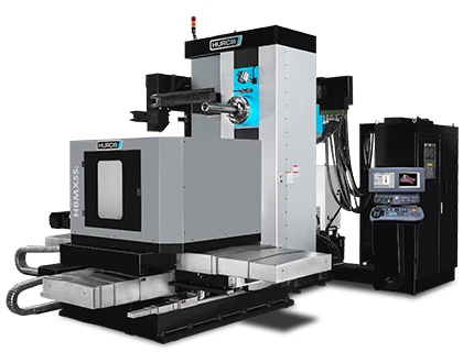 For the energy sector, the Hurco HBMX55i boring mill will be of particular interest. The HBMX55i horizontal boring mill has a small footprint (18 feet 4.37 inches x 17 feet 3.28 inches) especially considering the large work envelope (55.1 x 55.7 x 43.3 inches). The HBMX55i has a W-stroke of 19 inches, a geared head spindle with two speeds, hardened box ways, unlimited angular movement of the B-axis, and weighs just over 21 tons (42,328 pounds). The boring mill has a 4.33-inch diameter quill that allows you to use shorter tools; a contouring 4th axis rotary table, not just positional; linear glass scales on X, Y, and Z axes to maintain thermal stability and increase accuracy; CTS; and a 60-tool ATC.