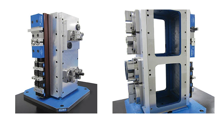 Minneapolis, Minnesota: Kurt ToolBlox feature an open-cage design weighing 30% less than a solid tombstone with aluminum subplates, making easier handling for the CNC machine table and shuttle systems. The ToolBlox class 30 grey Iron iron construction continues to provide the vibration dampening for a rigid setup even compared to much heavier tombstone alternatives.