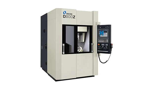 Designed with an integral chuck to maximize work-zone volume and load capacity, the D200Z accommodates workpiece sizes up to 300mm in diameter and 210mm tall with weight up to 75kg. The X, Y, and Z axes (350mm, 300mm and 250mm travels, respectively) provide swift movement with rapid traverse and cutting feedrates of 60m/min. The D200Z has also adopted a unique, lightweight B-axis tilting structure with 180° (0° to +180°) of tilt capability at 100rpm. Both the B-axis and rotational C-axis (360° continuous at 150rpm) feature direct-drive motors for agile, accurate, high-speed, responsive angular and rotational operation.